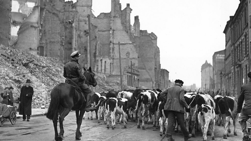 In 1945, the Red Army occupied part of Berlin as World War II came to an end. Witness speaks to one German woman about life in the city under the Soviet troops. (Photo: A Russian soldier on horseback supervising German prisoners of war as they drive a herd of cattle past Stettiner Railway Station on the way to Russia, 23rd October 1945. (Credit: George Konig/Keystone/Getty Images)