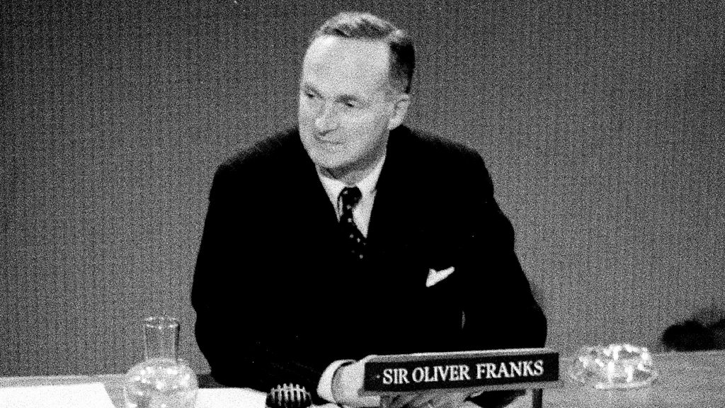 This year's Reith Lecturer is the Chairman of Lloyds Bank, Sir Oliver Franks. He is the former Provost of Queen's College, Oxford, and the former Professor of Moral Philosophy at University of Glasgow. He was the British Ambassador in Washington, DC, between 1948 and 1952, and has been described as "one of the founders of the post-war world". He delivers his Reith series entitled 'Britain and Tide of World Affairs'. In his third lecture entitled 'The Atlantic Bridge', Sir Oliver explores the relationship between the United States of America and Britain. He discusses the frictions between the two countries and their mutual interdependence. He analyses the discomforts of the passage of power, McCarthyism, and the fear that the United States will land us in a third world war.