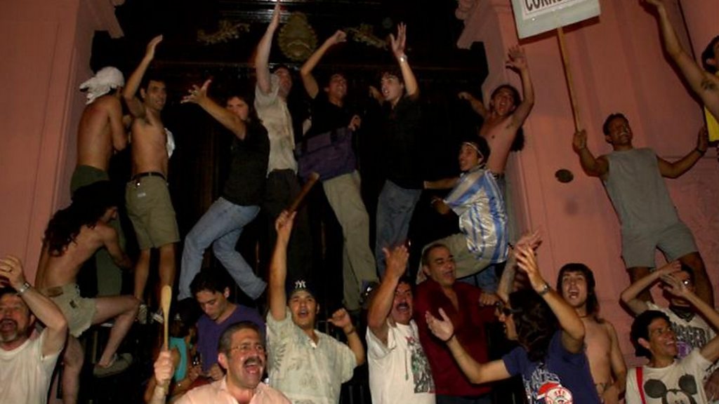 It is 10 years since the height of the financial crisis in Argentina. Bank accounts were frozen and tens of thousands of ordinary people took to the streets in protest. Photo: Demonstrators climb the gates of Government House in Buenos Aires. Credit: Associated Press.
