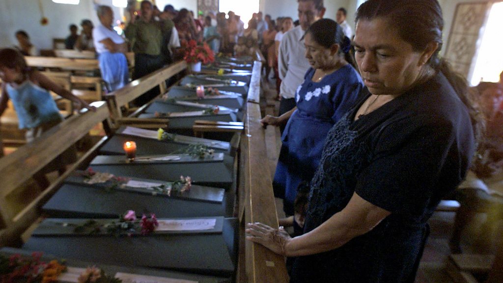 In December 1981 hundreds of peasants were killed by the army in El Salvador. Men, women and children from the village of El Mozote were shot. Only one woman, Rufina Amaya, is known to have survived. Photo: Rufina Amaya at a funeral for the victims held in 2001. Credit AFP/Getty images