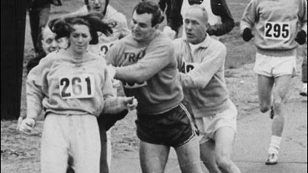 In 1967, the American athlete Kathrine Switzer, became the first woman to run the Boston Marathon. At the time, athletics officials believed women were incapable of running more than a mile and a half. After crossing the finishing line, Switzer was disqualified. It was an experience that turned her into a campaigner for women's sport. Picture: A Boston Marathon official attempts to stop Katherine Switzer, Credit: Associated Press