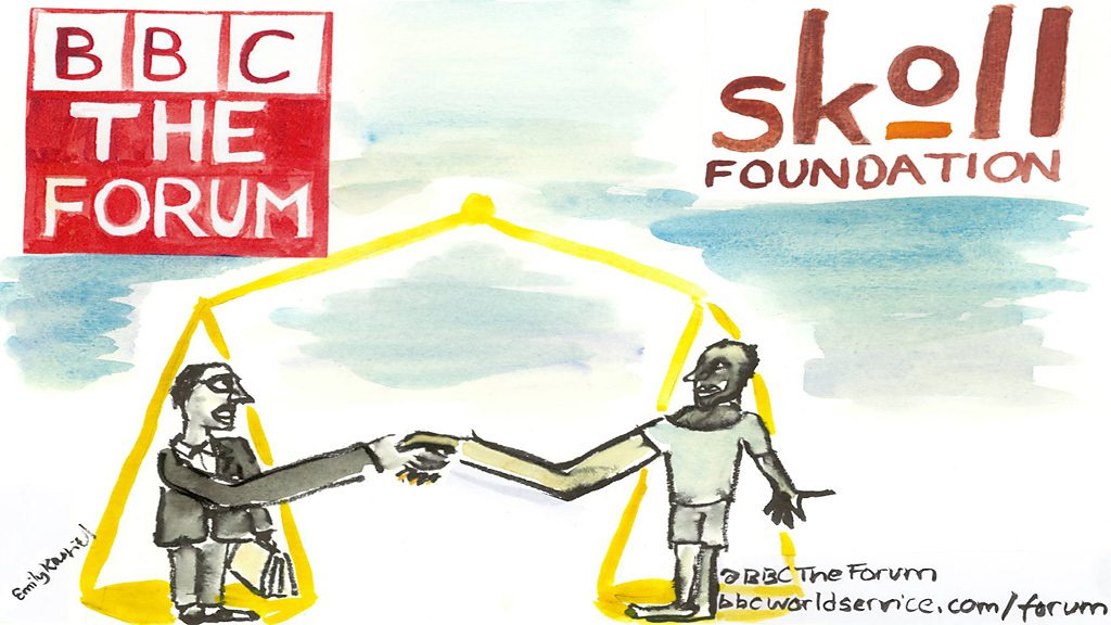 This week the Forum is in Oxford, at the Skoll World Forum gathering of social entrepreneurs, who seek to transform the world by empowering some of the world's poorer communities. Social enterprises usually support worthy causes but how can a powerful investor and a vulnerable small business in need of funding really have a partnership of equals? And how do outside innovators avoid the trap of imposing outside ideas on communities keen to preserve their traditions and their own vision? Bridget Kendall is joined in on stage at the Saïd Business School by UNICEF’S Geeta Rao Gupta, and two social entrepreneurs, William Foote and Brizio Biondi-Morra. Plus a lively audience ready to share thoughts, doubts and experience. Illustration by Emily Kasriel