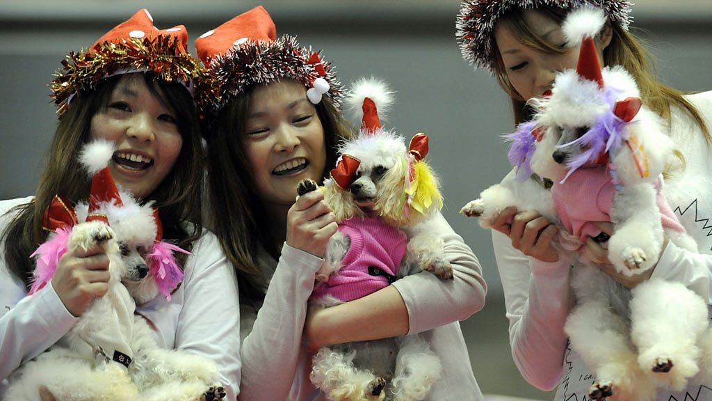 Startlingly, in a country having kittens over its plummeting birth-rate, there are now twice as many pets in Japan as there are children. While the average age of Japan's population has been steadily climbing and birth rates falling rapidly, Japan has become a pet superpower. As the number of dogs has increased, so too has the number of childless women and couples, many of whom dote on their dogs in place of children, lavishing luxuries and all kinds of anthropomorphic privileges on them. Small pedigree breeds such as chihuahuas or tiny purse-sized poodles are preferred and highly prized. Some of the luxuries on offer include dog kimonos, fake fur coats and $1,500 Hermes leather tote bags and collars. Dog buggies, nappies, sunglasses and hats are “must have” items for any self-respecting dog owner. Roland Buerk seeks an explanation for this explosion in interest in all things canine, and explores the demographic time-bomb behind it. If Japanese women continue to reject marriage and children in favour of doggy love, what will be the impact on Japan's population? (Image shows young Japanese women carrying poodles in the Tokyo International Dog Show 2010. Credit: AFP/Getty Images)