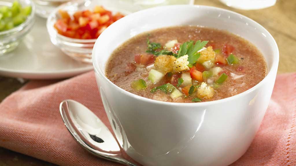 Food writer Felicity Cloake creates the perfect Gazpacho. A Spanish classic, this chilled soup originates from southern Andalucia and is essentially a peasant dish, designed to make use of cheap very ripe Mediterranean ingredients. The recipe can vary but is a combination of some or all of the following - tomatoes, peppers, garlic, cucumber, not forgetting crusty white bread, sherry vinegar and a generous slug of olive oil. This recipe is taken from '68 Essential Recipes for Every Cook’s Repertoire' by Felicity Cloake.