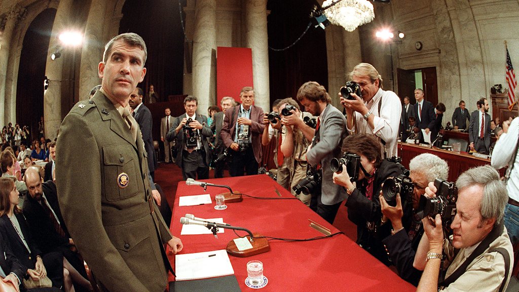 Colonel Oliver North gives evidence before the congressional select committee about his role in the sale of arms to Iran, the profits of which funded the Contras in Nicaragua.