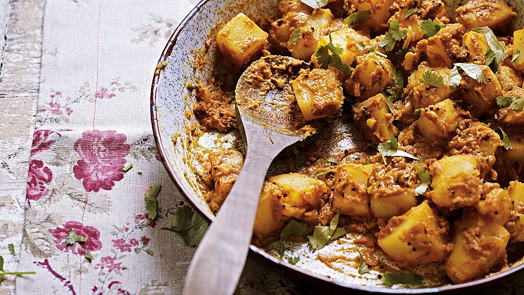 TV chef Anjum Anand demonstrates her recipe for Bombay potatoes from 'Anjum's Indian Vegetarian Feast' (published by Quadrille, photo Emma Lee).