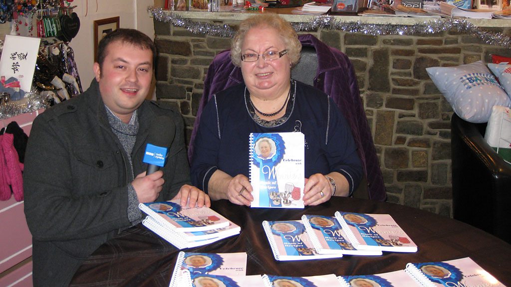 Terwyn Davies yn sgwrsio gyda Winnie James yn Siop Siân, Crymych ar ddydd lansio'i llyfr.