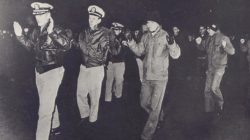Forty-five years ago an American spy ship was captured by North Korean forces. The crew of USS Pueblo were held for almost a year, but they found small ways to resist. 'Skip' Carl Schumacher, a 24 year-old 1st Lieutenant, who was on board USS Pueblo, describes their ordeal. Photo: USS Pueblo's crew taken by North Korean military.