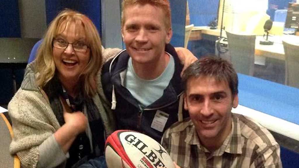 Dafydd a Caryl yn sgwrsio gyda hyfforddwr rygbi y Sgarlets Garan Evans.