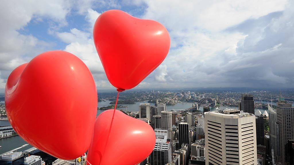 Nine short stories from around the world, looking at who we fall in love with, the way we do it now, and how it's changing. (Photo: Heart-shaped balloons tied to the roof of a building overlooking Sydney skyline. Credit: AFP/Getty Images)