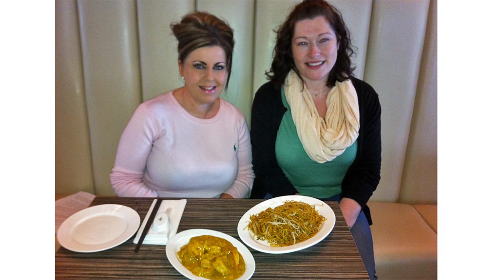 Nia'n mwynhau cyri corgimwch a nŵdls gyda Bethan Roberts o Gaernarfon i ddathlu'r Flwyddyn Newydd Tseineaidd.