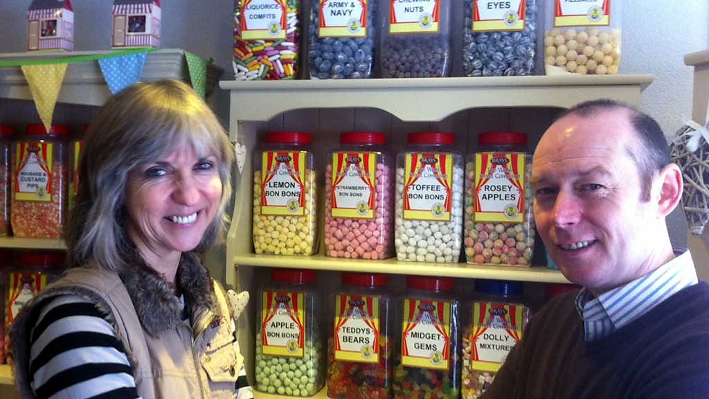 Sian Roberts gyda Steve Atwell, perchennog y Sugar Mouse House, Rhiwbeina, sydd â'i holl siocled a losin yn dod o Gymru.