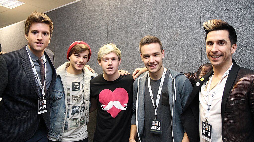 Greg James and Russell Kane chat to the One Direction boys backstage at the BRIT awards.