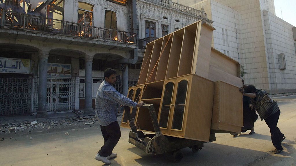 In April 2003, Baghdad descended into chaos as American troops took control of the city. We hear the story of one Iraqi doctor who witnessed the lawlessness that engulfed Iraq's capital. (Photo: Looters in Baghdad 11 April 2003. AFP/Getty)