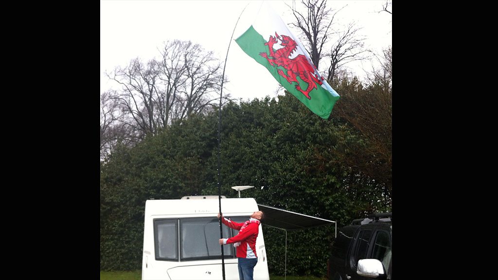 Mark Hutchings talks to rugby fans at a campsite in Cardiff who couldn't get tickets but say they are there "for the atmososphere".
