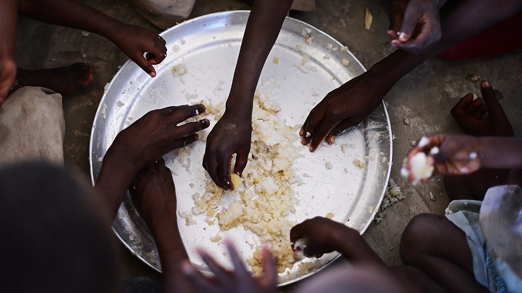 Professor David Kabasa, the Principal of the College of Veterinary Medicine at Makerere University, Professor Sam Kyamanywa, the Principal of the College of Agricultural and Environmental Sciences at Makerere University, Dr Jimmy Pittchar of ICIPE in Kenya, and Dr Florence Lubwama Kiyimba of Uganda’a National Agricultural Research Organisation are all working to improve the productivity of farming in Africa. They join Gareth Mitchell and Alan Kasujja in the tent at Makerere University in front of an audience to talk about the disconnect between farmers and researchers, and how this can be overcome. They also discuss the place of GM crops in Uganda, a method of farming called push pull in which pests are controlled without the need for externally applied chemicals, and the need to develop ways of processing and marketing surplus crops. (Image: Children eating rice. Credit: CARL DE SOUZA/AFP/Getty Images)