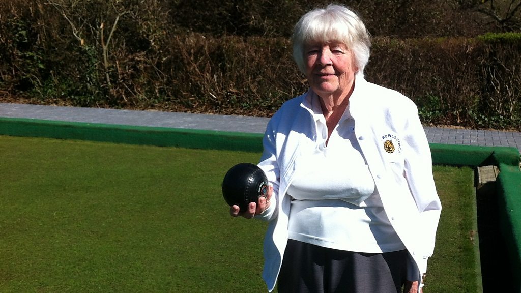 Highcliffe's club coach Betty Blunden teaches Neil Sackley to bowl. Just.