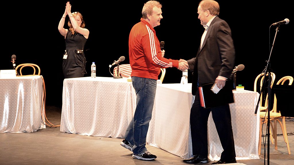 Have you ever wondered what happens at one of our recordings? It is really important for us to have a warm up act on stage, to get the audience ready for the show and to help our technical team get all of the sound levels correct before the recording begins. Here is a clip of Raymond Mearns and Clive Anderson chatting to the audience before the show.