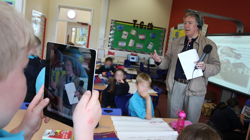 Hywel Gwynfryn yn ysgol T Llew Jones ac yn clywed am brosiect ffilm 'Cadw'r Cof'.