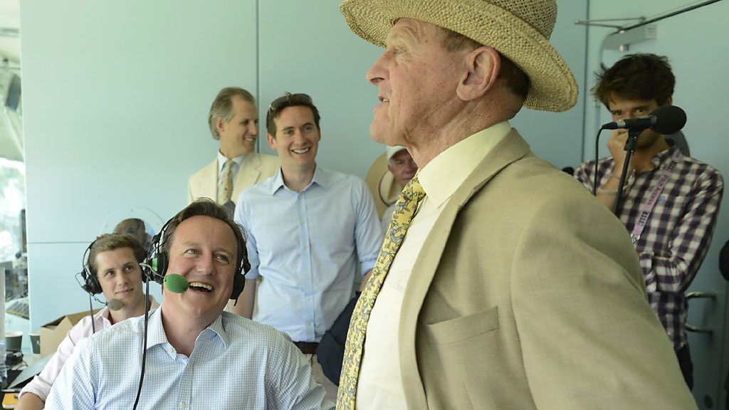 Prime Minister David Cameron encounters Geoffrey Boycott in the Test Match Special commentary box.
