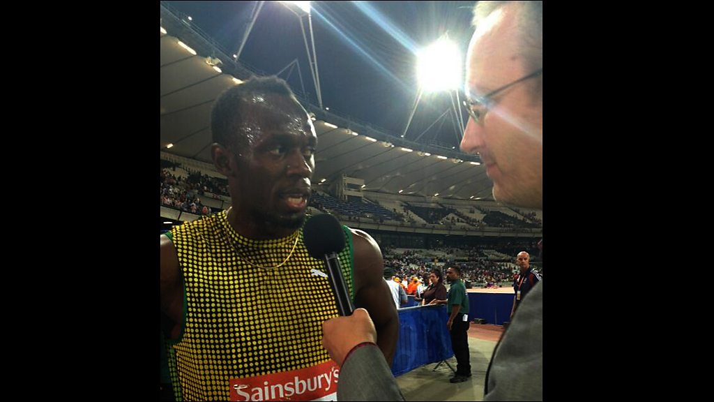 5 live's Jonathan Overend describes meeting Usain Bolt and, after expecting him to move to his next interview, the 'rocket man' casually enquires about the BBC following his 4 x 100m relay win.