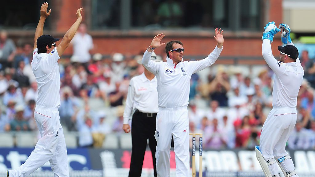 Australia's Usman Khawaja is dismissed after being caught behind by Matt Prior off the bowling of Graeme Swann.