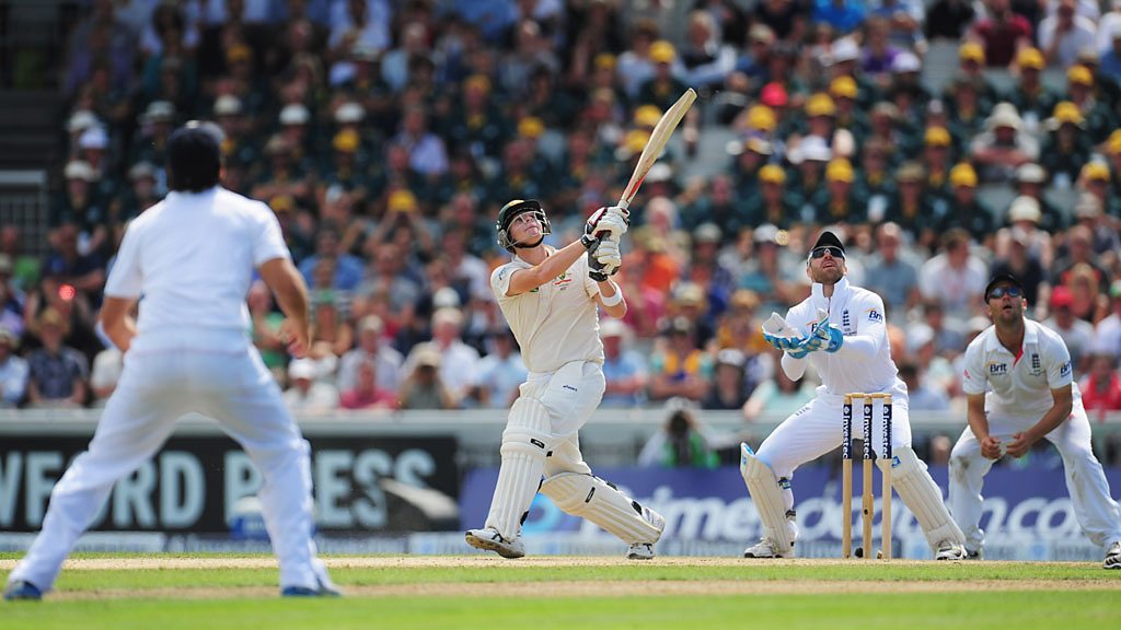 Australia's Steve Smith is out for 89 caught by Jonny Bairstow off the bowling of Graeme Swann. A move which caused Geoffrey Boycott to call the batsman "a muppet".