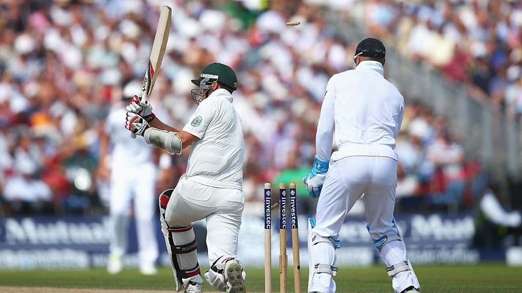 Australia's Peter Siddle is out for 1 bowled by Graeme Swann.