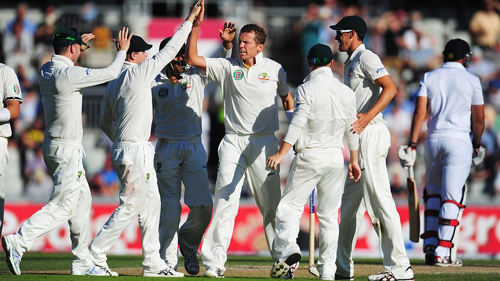 England's Tim Bresnan out for 1 from the bowling of Peter Siddle.