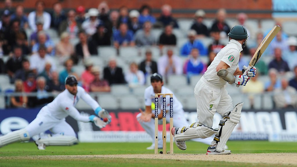 Australia's Chris Rogers is caught off the bowling of Stuart Broad for 12 on the fourth day of the third Ashes Test.