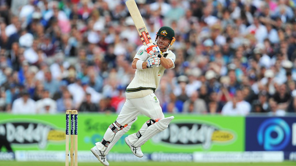 Australia's David Warner is caught off the bowling of Tim Bresnan for 41 on the fourth day of the third Ashes Test.