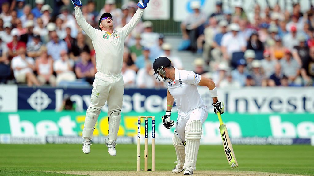 England's Kevin Pietersen is caught behind off the bowling of Nathan Lyon.