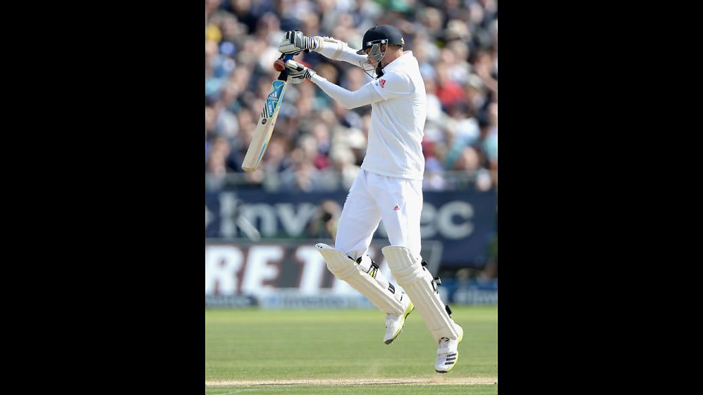 England's Stuart Broad is out for 13 to the bowling of Ryan Harris.