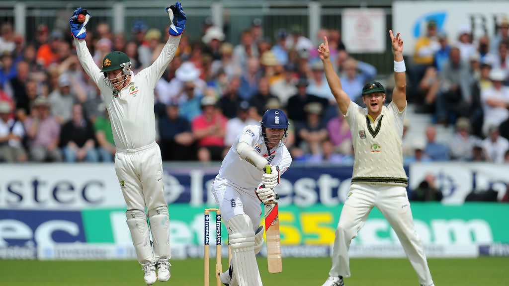 England's James Anderson is out for 0 to the bowling of Nathan Lyon.