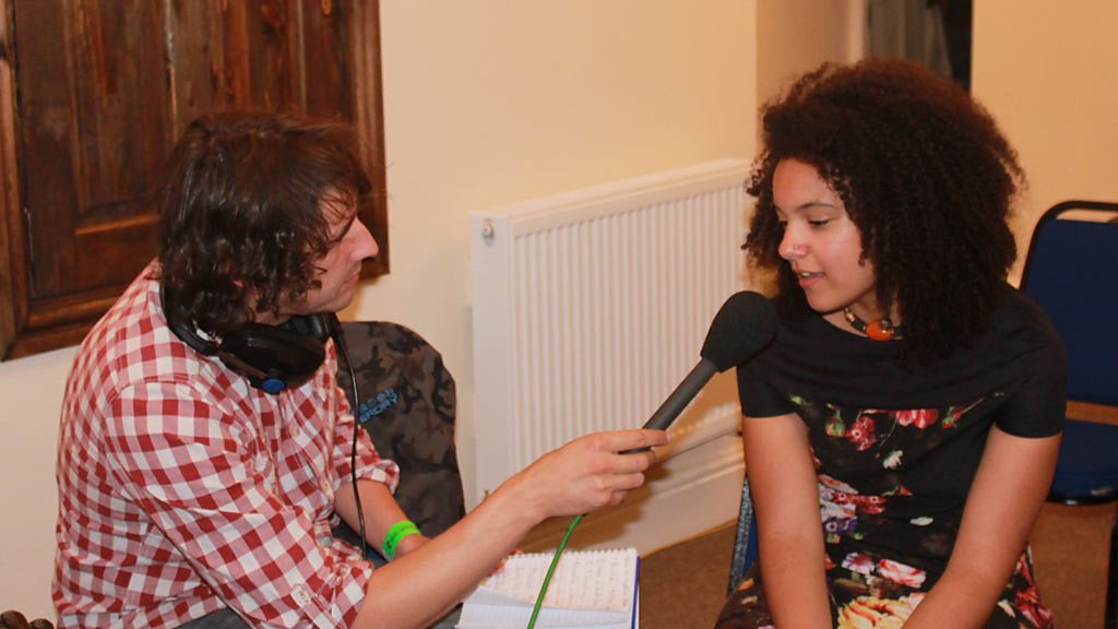 Gethin Evans yn sgwrsio gyda Kizzy Crawford yn gig Cymdeithas yr Iaith Eisteddfod Dinbych.