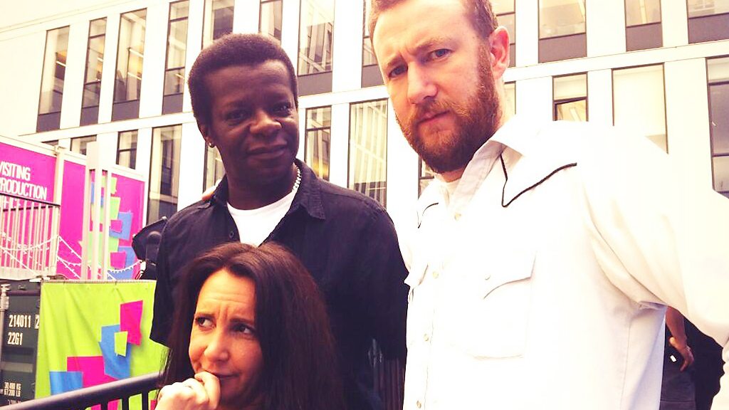 Fred shifts up and welcomes Stephen K Amos, Lucy Porter and Alex Horne to the sofa.