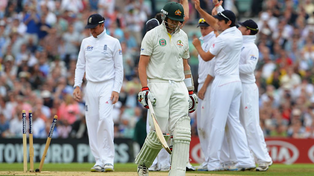 Jimmy Anderson bowls out Australia's Peter Siddle as play begins after a rain delay.