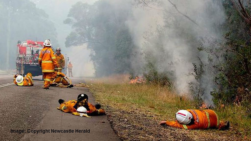 Australian photographer, Phil Hearne, says "exhausted firefighters" rested by side of the road, in between fighting walls of flames in New South Wales.
