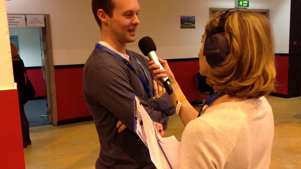 Nia Roberts yn siarad gyda Tomos Williams o Burum yn ffair WOMEX