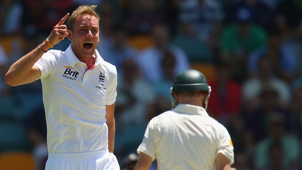 The first wicket of The Ashes series in Australia falls to England's Stuart Broad.
