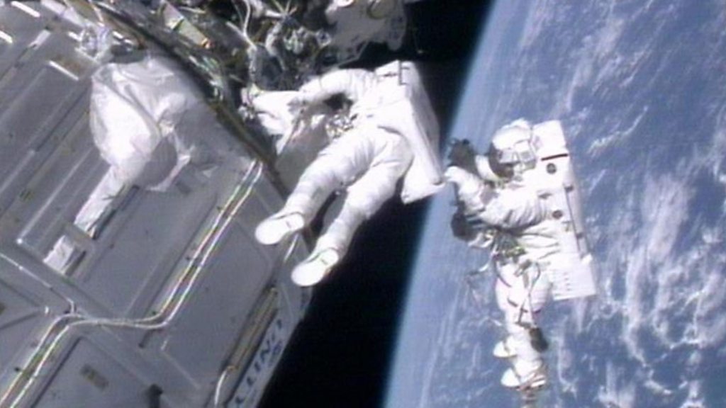 In December 1998, NASA astronaut Bob Cabana and Russian cosmonaut Sergei Krikalev were the first on board the International Space Station, after the first two modules - Zarya and Unity - were joined together in orbit. PHOTO: AP / NASA TV