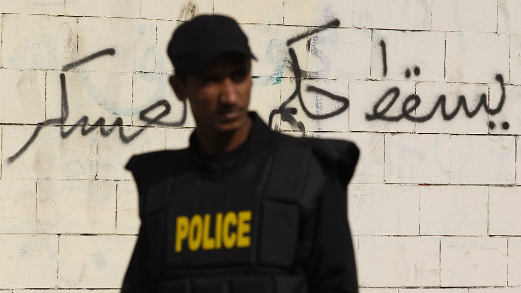 Egypt's Muslim Brotherhood denies accusations of terrorism, after a bomb explodes a day after the government designated the group a "terrorist organisation". Also, as the leaders of Kenya and Ethiopia head to South Sudan for talks, is it down to African governments to solve Africa's problems? Picture: A riot police officer stands guard at the scene of a bomb blast along a wall covered with graffiti around the Al-Azhar University campus in Cairo"s Nasr City district The graffiti says, "Down with military rule." Credit: Reuters / Amr Abdallah Dalsh