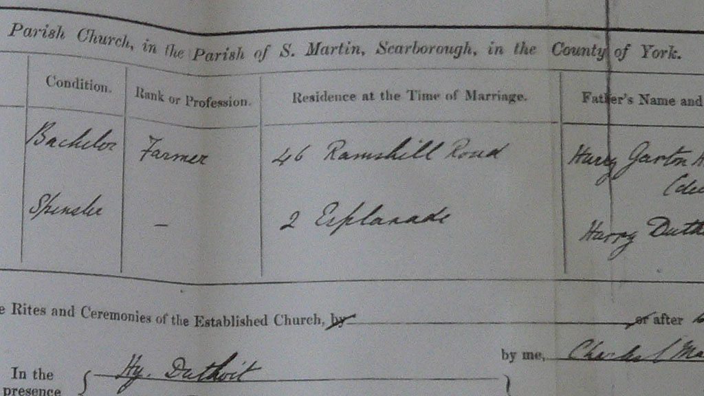 Richard Garton Horsley and Winnifred Louise Duphoit married on the day of the Scarborough bombardment (16 December 1914). There is no evidence of any other wedding in the town that day. Winnifred had attended St Martins on the Hill on the morning of her wedding for Holy Communion. While this was taking place, the bombardment began. Despite the church having been hit, the vicar decided to go ahead with the marriage service. The bride saved a piece of shrapnel from the momentous day. She went on honeymoon with her new husband on a motorbike and sidecar. They were caught up in crowds of people fleeing Scarborough. The couple’s marriage lasted for more than fifty years. In the church, some of the design is missing where it was hit by the shell. Location: St Martin’s on the Hill Church, Albion Road, Scarborough, North Yorkshire YO11 2BT Image shows Richard and Winnifred’s marriage certificate, courtesy of their son, Geoffrey Horsley Presented by BBC Reporter, Jonathan Cowap