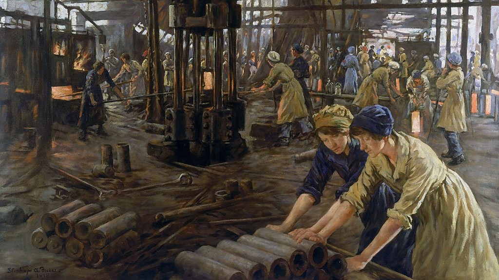 There's a painting at the Science Museum in London showing a shell factory in Rotherham during World War One. Like many other steelworks during the war, John Baker & Co.'s site at Kilnhurst was converted to make ammunition. The company produced over six million shells and women made up a large part of the workforce. Many in Britain, both in the army and society, were shocked by the amount that munitions workers could earn. Although it was less than the men they worked alongside, sometimes the women were on better pay than soldiers at the front. The company commissioned a painting in 1918 by a famous artist Stanhope Alexander Forbes as a record of the war effort. When it was purchased by the Science Museum and put on display in 1984 - three of the surviving women who had worked there were tracked down and spoke to BBC Radio Sheffield. Thirty years ago Sarah Tooley, at 91 years of age, was the oldest. Betty Muscroft and Lydia Newby were 82. Without the efforts of thousands of women munition workers the Allies might not have won the war, but one of the women told BBC Radio Sheffield she felt some misgivings that the shells she made as a teenager had killed so many thousands of young German men. Location: Kilnhurst Steelworks, Rotherham, Yorkshire S60 1DX Image of the Munition Girls courtesy of Bridgeman Art Library Presented by BBC Reporter, Kate Linderholm