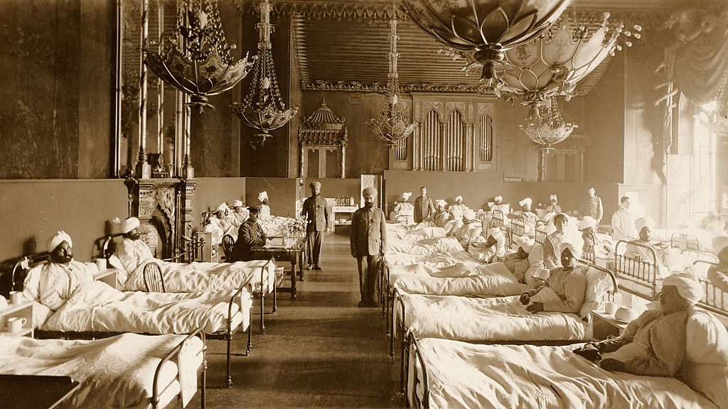 Brighton is one of the most diverse places in the country where dozens of different faiths and nationalities live side by side. And yet the city keeps its English seaside feel too, thanks in part to some amazing pieces of architecture, such as the pier, the grand hotel and the Royal Pavilion. The Pavilion attracts 300,000 visitors a year, all taking in the Regency folly and grandeur of the place. But 100 years ago the Pavilion was quite a different place. From 1914 to 1918, the prestigious Royal Pavilion estate was used as a military hospital for wounded Indian soldiers. A total of 724 beds were available and by the end of the war, more than 4,000 Indians and Gurkhas had been treated here. Brighton had three hospitals for Indian soldiers at the time, the others were the York Place schools that were converted into a hospital for the more heavily wounded, and the Elm Grove workhouse, which was renamed the Kitchener Hospital and treated less serious casualties. The Kitchener was the largest and held 2,000 beds, but the Royal Pavilion became the most famous. The makeshift hospital and its patients were photographed for postcards; over 120,000 of these were sold in Brighton alone. Some of them were published in a remembrance book, written in English, Urdu and Gurmukhi (Indian Punjabi). Copies of the work (20,000) were also distributed in India. Paintings and a short film were also produced. Little is known about the contribution of Indian troops to the World Wars, namely, they fought with the British and made up the largest volunteer armies: 1.5 million in World War One and 2.5 million in World War Two. Location: The Royal Pavilion, Brighton, Sussex BN1 1EE Image shows soldiers recuperating in Ward 5 (the Music Room) inside the Pavilion Image courtesy of the Royal Pavilion and Museums, Brighton & Hove Presented by Davinder Dhillon