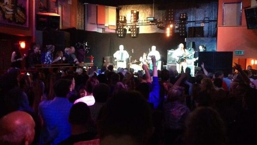 The BBC's Jon Kay reports from a Wurzels music gig raising money for flood victims.