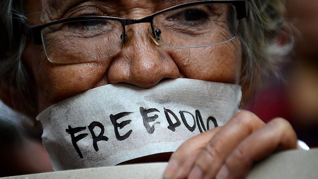 David Amanor presents a special edition of the Fifth Floor marking the end of the BBC's Freedom 2014 season. Music São Paulo singer Monica Vasconcelos and her quartet perform Brazilian protest songs from the 1970s that rebelled against the military junta - Apesar de Voce, Carcara, and Rei Morto Rei Posto Discussion Does the freedom to report come at a cost? BBC Language Service journalists Behzad Bolour, Priyath Liyanage and Kasim Kayira debate freedom and journalism in Iran, Sri Lanka and Africa's Great Lakes. Satire What have two African presidents got to say on the subject of freedom in the 21st Century? Resident President Kibarkingmad (sort of democratically elected) and His Excellency Haile Unlikely (in office for a number of decades) ponder what it feels like to be free. History Did you know that the first ever African-American newspaper to be published in the US was called the Freedom Journal? Kim Chakanetsa tells the story of this pioneering paper - that was printed well before the abolition of slavery. Photo: Filipino protester in Manilla. Getty Images.