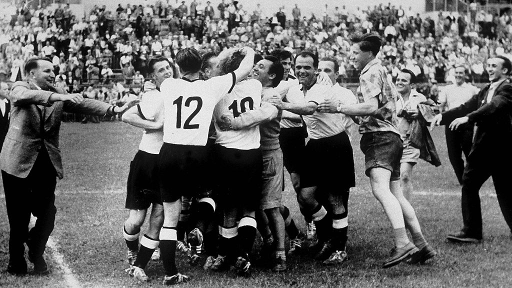 In 1954, West Germany faced the all-powerful Hungarian side of Ferenc Puskas in the football World Cup final in Switzerland. Despite going two goals down, the Germans fought back and seized an epic win with six minutes to go. The 'Miracle of Bern' gave a new sense of confidence to a nation still scarred by Nazism and the legacy of World War Two. Lucy Burns brings together archive recordings of two of the German footballers who played in the match. (Photo: The West German team celebrate at the final whistle. Credit: Bongarts/Getty Images).