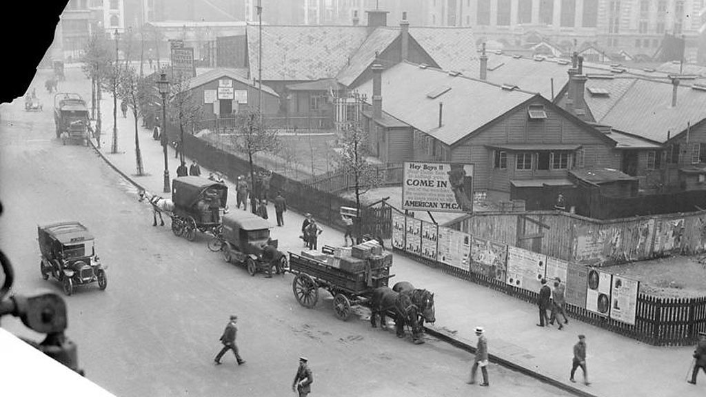 Following the US entry in World War One, servicemen’s centres were set up around London. One of the most remarkable centres was The Eagle Hut in Aldwych, a place where American troops could stay, relax and enjoy the comforts of home in the heart of the capital. It began operating in August 1917; four months after America entered the conflict, and was officially opened on 3 September by the US Ambassador and veterans of the US Civil War. Run by the Young Men’s Christian Association, the temporary wooden buildings spread over 35,000ft. It was equipped with a barber’s shop, a concert hall, a billiards room, a lounge, kit room as well as 420 beds for off-duty soldiers who had no other place to stay while in London. A canteen would serve American favourites such as pancakes and hash browns. Eight hundred volunteers, mostly women, worked at the Eagle Hut and on any given day served as many as 5,000 meals. It’s estimated some two million plates of food were served in the two years it operated. The hut was meant to be a home away from home, tending to the physical, emotional and spiritual needs of young men who were thousands of miles away from home. It was closed in August 1919 – just before peace was declared. Location: Aldwych, London WC2B 4PJ Image shows the Eagle Hut Photograph courtesy of Imperial War Museums Presented by Christina Comber from the YMCA with archive audio courtesy of Caroline Rennles from Imperial War Museums