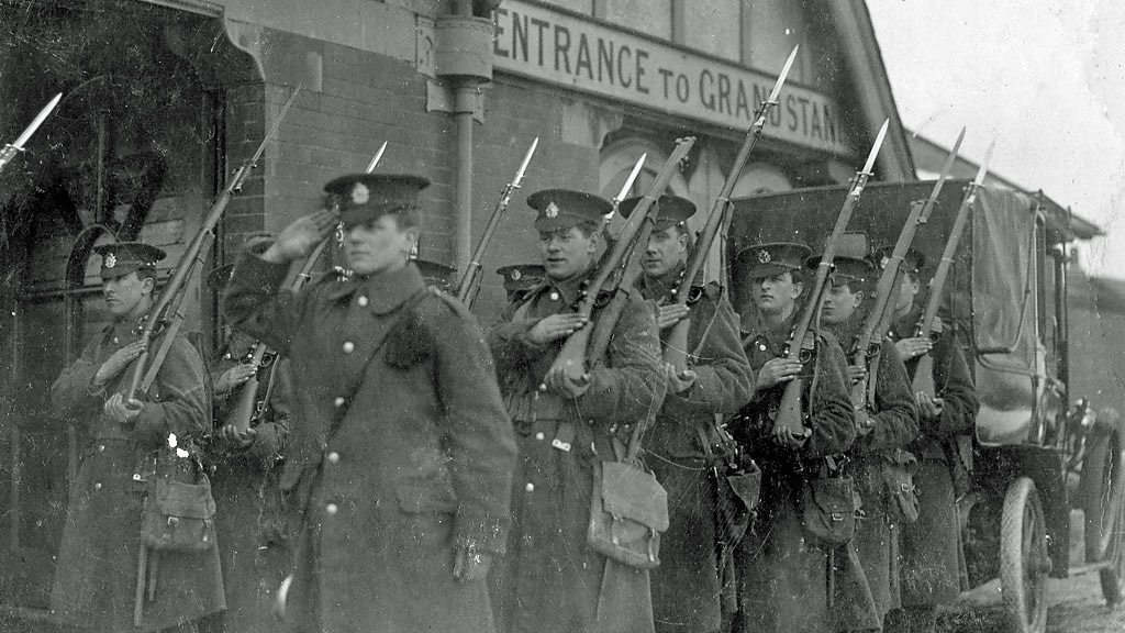 The ability of Kitchener's Volunteer Army of 1914 to train and house thousands of men who flocked to its ranks at the start of the war stretched its resources to breaking point. Carlisle was no exception, and when the local Lonsdale battalion was formed in September 1914, the only suitable location for a training camp was the racecourse at Blackwell, situated on the edge of the city. The Battalion was comprised of local men drawn from the railways, factories, shops and fields of Cumberland and Westmorland, who felt it was their patriotic duty to serve their King and Country. Initially, conditions were so inadequate that soldiers who could return would go back home to sleep at night, and those that couldn't, made themselves as comfortable as they could in the empty horse boxes and grandstand. Eventually wooden huts were erected but the 'make do and mend' approach continued, with the soldiers lacking even basic equipment like a rifle and a uniform until 1915. Lord Lonsdale took a great deal of pride in the battalion named after him, and issued the men with a solid sliver cap badge that he commissioned from Garrard's the Crown jewellers. But any hope the soldiers might have had that war would be over by Christmas was dashed by the war in Europe turning into a stalemate, and the Battalion embarked for France in November 1915. The Lonsdale Pals first saw action in the battle of the Somme on 1 July 1916, and as they had joined forces, they fought together and died together. Out of 28 officer; 25 where killed or injured, and of 800 other ranks; 500 were injured or killed. The commanding officer's widow concluded that: “men could do no more”. Location: Blackwell Racecourse, Carlisle, Cumbria CA2 4TS Image shows Blackwell camp (March 1916) Report presented by Andrew Carter